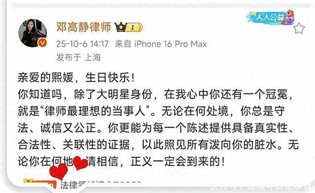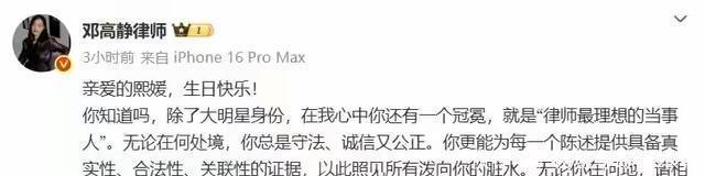 结果没想到,邓高静在大S去世之后的第一个生日那天发了一篇悼文。 邓高静话里话外的意思都是在夸大S,说大S是所有律师心里最理想的一个当事人,毕竟有什么事儿都能拿出最合理合法的证据,还特别强调了正义迟早有一天会来。