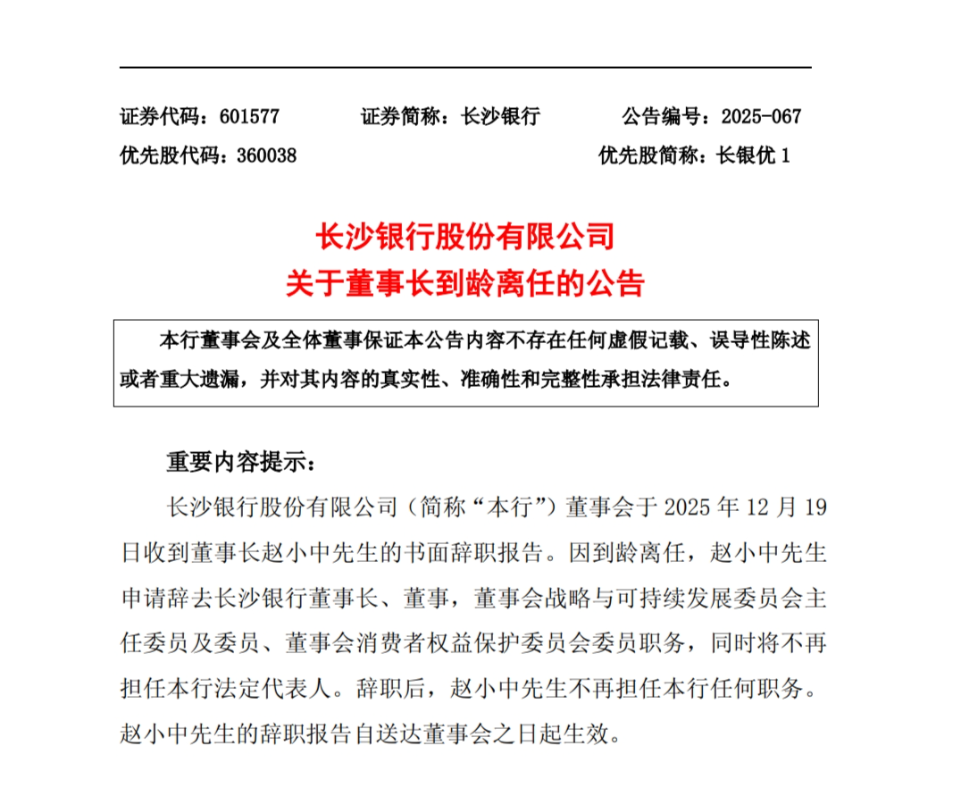 12�日,长沙银行发布公告,公司董事会���日收到董事长赵小中的书面辞职报告。因到龄离任,赵小中申请辞去长沙银行董事长、董事,董事会战略与可持续发展委员会主任委员及委员、董事会消费者权益保护委员会委员职务,同时将不再担任本行法定代表人。辞职后,赵小中不再担任本行任何职务。赵小中的辞职报告自送达董事会之日起生效。